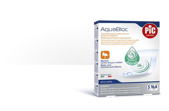 После операција или примање конци или кога лекувате рани од големи размери, фластер што комбинира практичност, хигиена и отпорност на вода е исклучително корисен. Aquabloc ја штити вашата рана од ризиците од инфекција, благодарение на широкиот спектар на анти-бактериска активност на хлорхексидин и создава долготрајна бариера против водата.